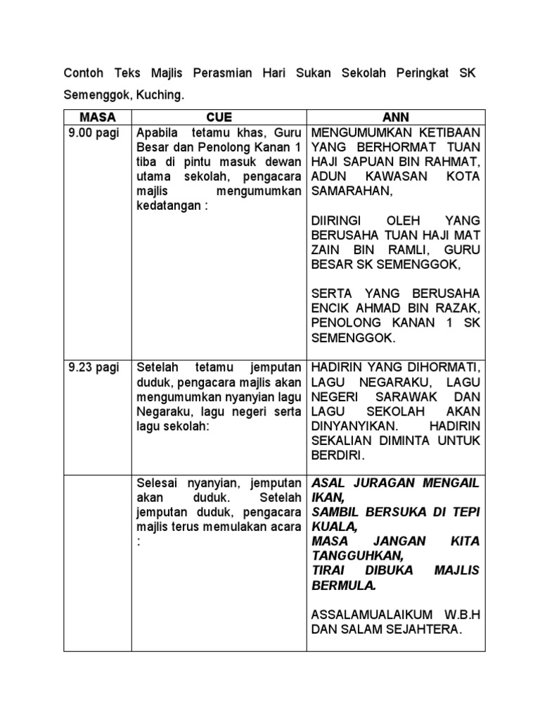 Teks Ucapan Perasmian Sukan : 0%0% found this document useful, mark this document as useful.. Teks ucapan perasmian ketua pengarah jabatan perancangan. Protokol pengendalian majlis rasmi via www.slideshare.net. 0%0% found this document useful, mark this document as useful. Teks ucapan 2021 induction programme for judicial commissioners 29 march 2021, opening remarks by tun tengku maimun binti tuan mat, the chief justice of malaysia. Majlis perasmian taska parlimen malaysia.